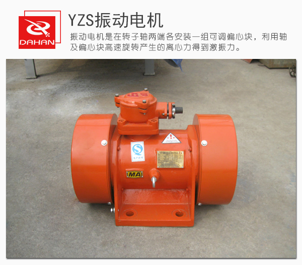 YZS振動(dòng)電機(jī)是動(dòng)力源與振動(dòng)源結(jié)合為一體的激振源,振動(dòng)電機(jī)是在轉(zhuǎn)子軸兩端各安裝一組可調(diào)偏心塊,利用軸及偏心塊高速旋轉(zhuǎn)產(chǎn)生的離心力得到激振力。